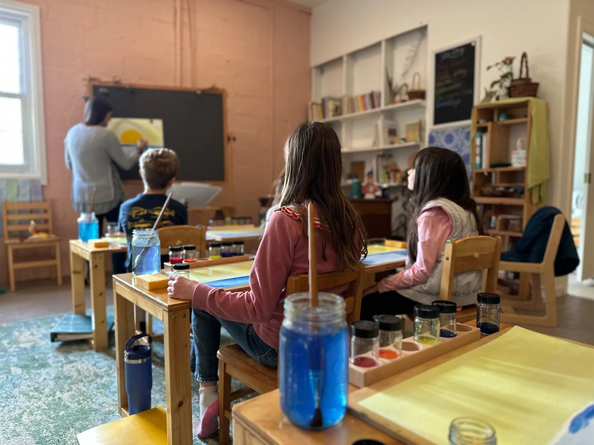 In our combined 3rd/4th grade class all areas of our curriculum incorporate imagination, art, nature and movement. The day starts with "main lesson" which is a 2-hour block of time that carries the rhythm and new material of the day. We start each day with movement and song, recorder playing and poetry. Our day then brings new academic material (which is always brought through imagination and applied with art) and finished with a story. Following the main lesson there is lunchtime, outside play and one of our many extra lessons: handwork(knitting and crocheting), watercolor painting, music, sculpting, Spanish, woodwork, gardening and form drawing.