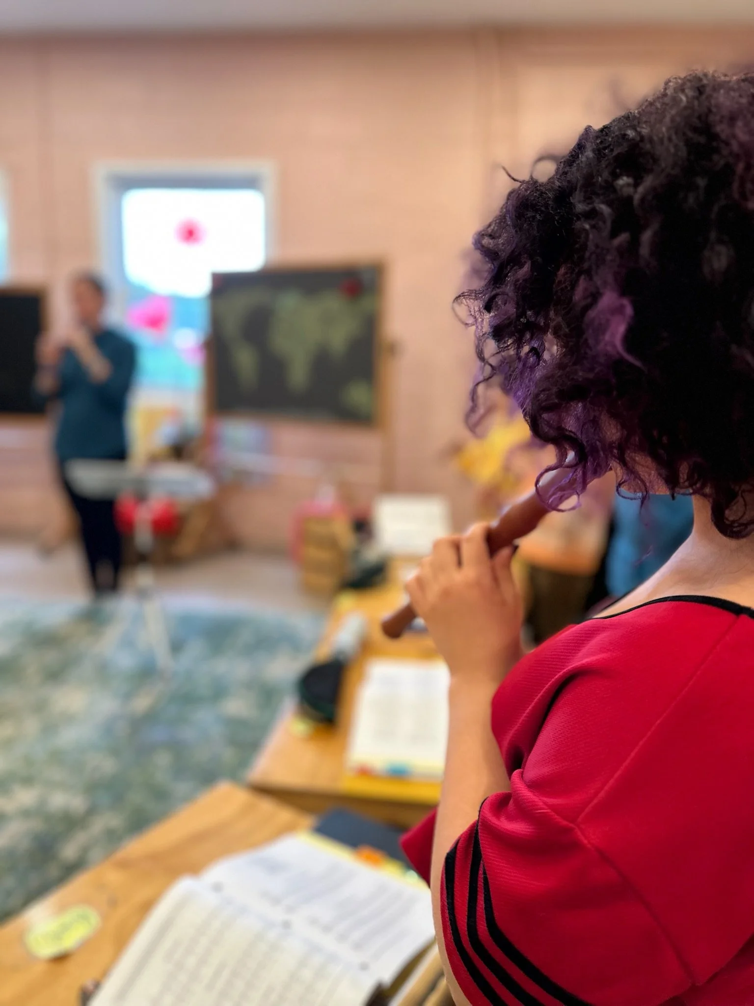 The first-grade year is focused on imagination, movement and integration. The day starts with "main lesson" which is a two-hour block of time that carries the rhythm and new material of the day. It usually starts with movement, songs, flute playing, integrative movement, and poetry. After the class has warmed to the day together in this rhythmic way then new academic material is introduced through imagination, applied with art and finished with a story.